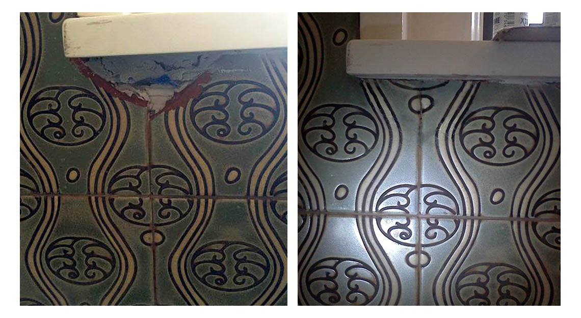 Broken bathroom tiles which were reset with original pieces. The cracks were refilled with an epoxy-based material, in-painted, and sealed.