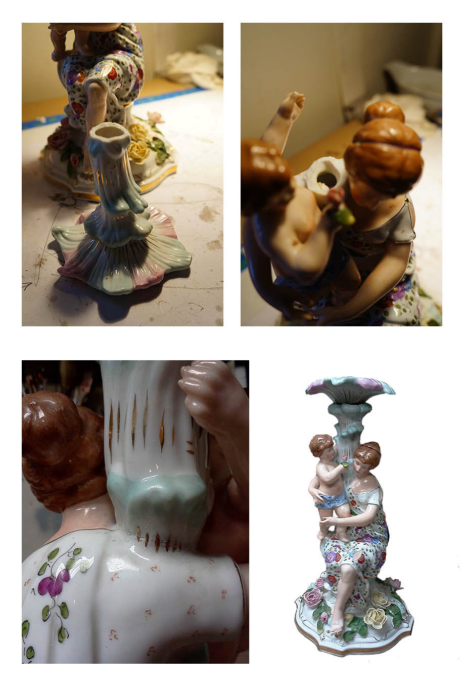 A broken, ceramic glazed scupture and vase, which was re-attached with an epoxy and retouched.